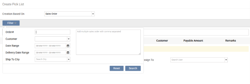 You can also search multiple sales orders by entering multiple sales order numbers separated by commas and then clicking Search. All the sales orders matching the filter criteria will display on your screen.