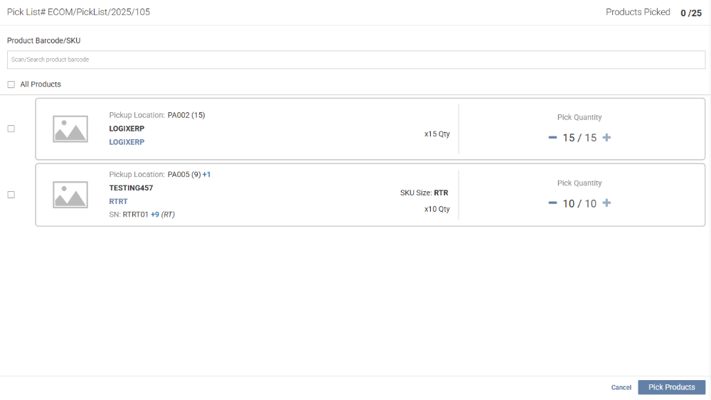 Select the product, then click Pick Product. A notification will confirm that the product has been picked successfully, and the picklist status will update to Closed.