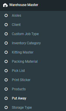 1. Step 1: In ERP, go to Warehouse Master. Select the Put Away sub-module.