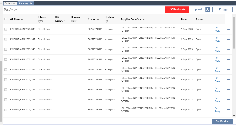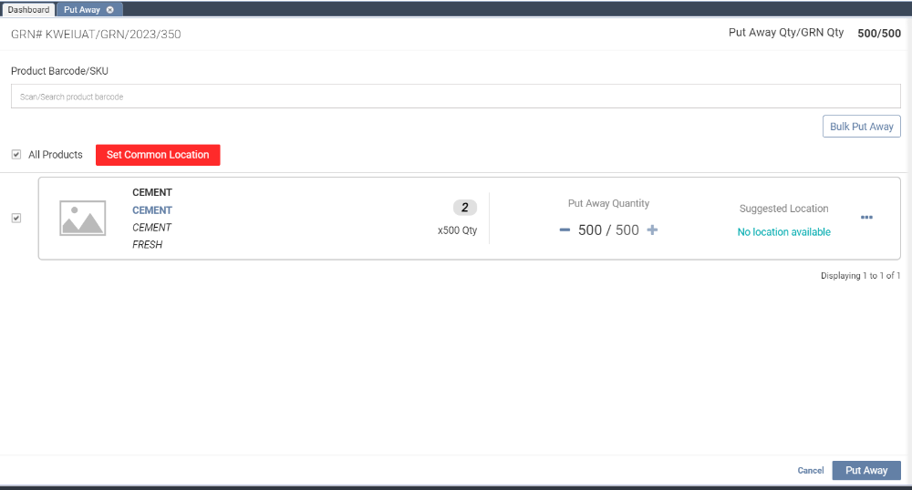 2. Step 2: After clicking on the Put Away sub-module, this screen will load (shown below). All created GRNs (Goods Receipt Notes) will be displayed for Put Away. You will need to click on Put Away.