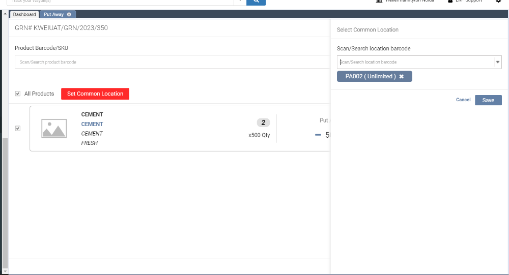 4. Step 4: Click on Set Common Location and search for the location barcode. After selecting the barcode, click Save.