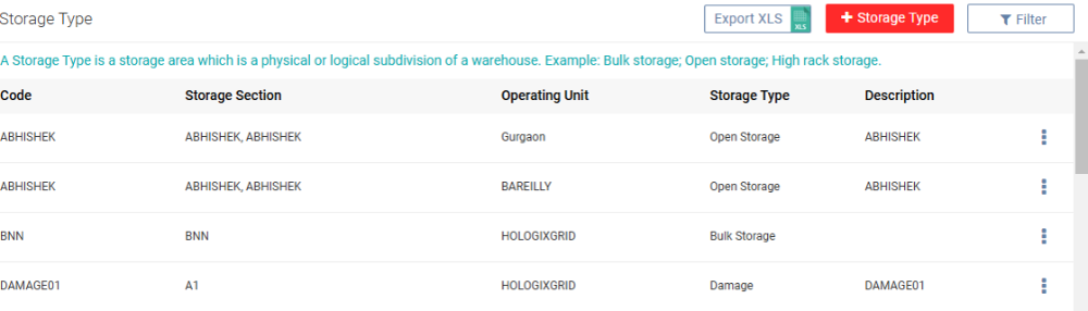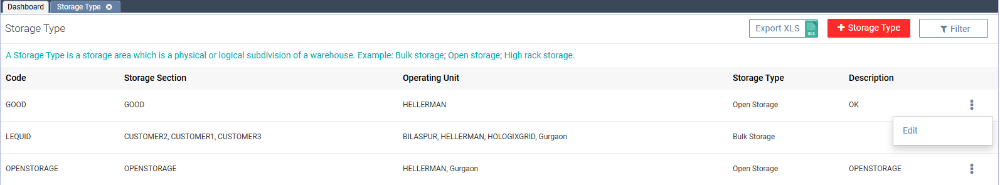 • Edit: Click on the three dots next to the storage type name and select Edit to modify the details.